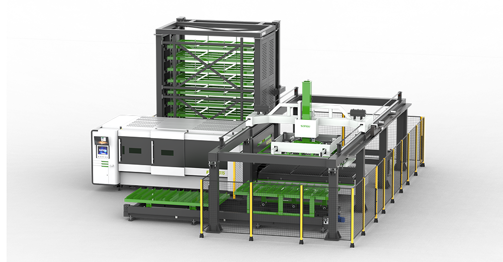 在松谷激光切割機(jī)的切割平臺(tái)上搭載 HyStore 系列自動(dòng)上下料及倉(cāng)儲(chǔ)系統(tǒng),通過(guò)軟件控制系統(tǒng)進(jìn)行串聯(lián)控制,實(shí)現(xiàn)無(wú)人值守的全自動(dòng)化智能激光切割生產(chǎn)線;